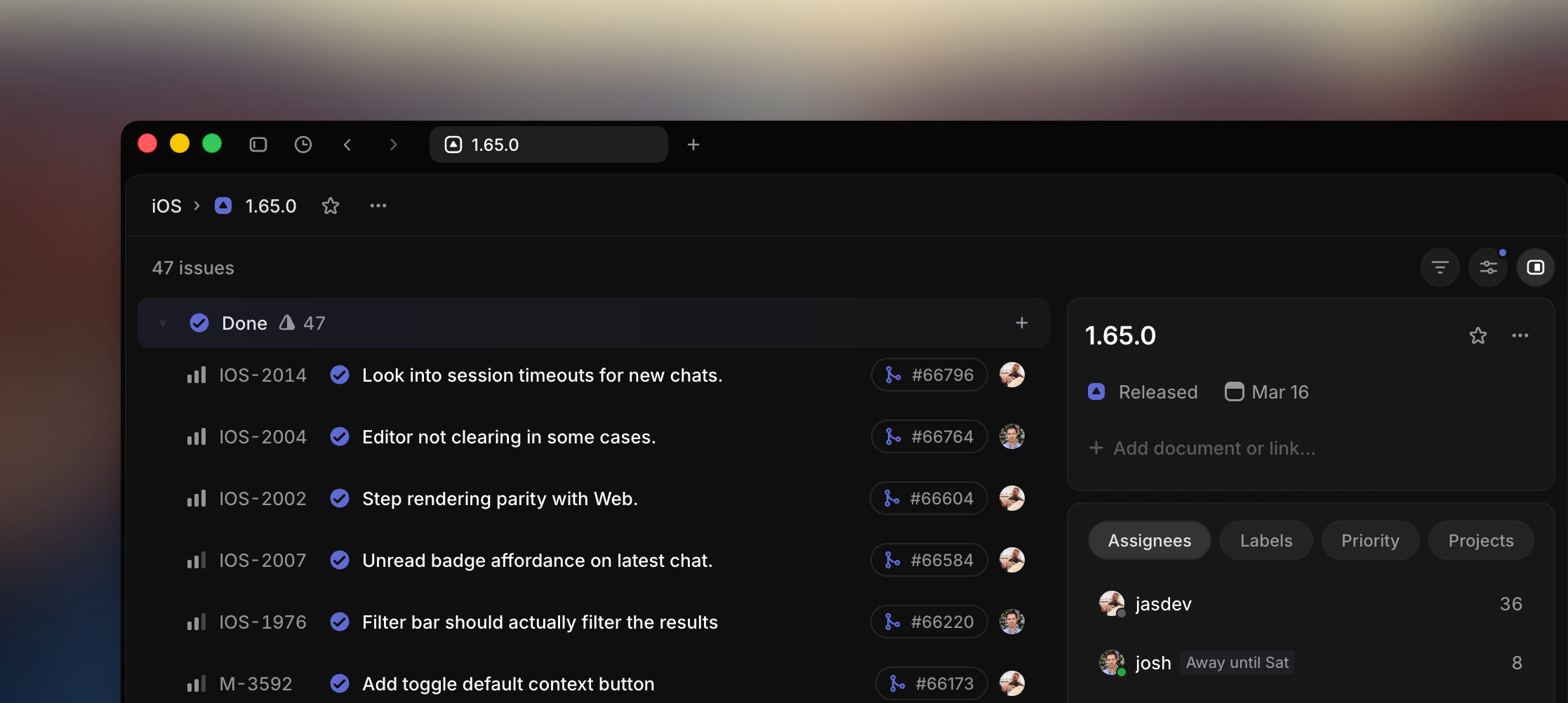 Linear can now answer these questions by integrating directly with your CI/CD system. After integrating, your issues are automatically grouped into releases—whether your team deploys continuously or on a scheduled release cycle.