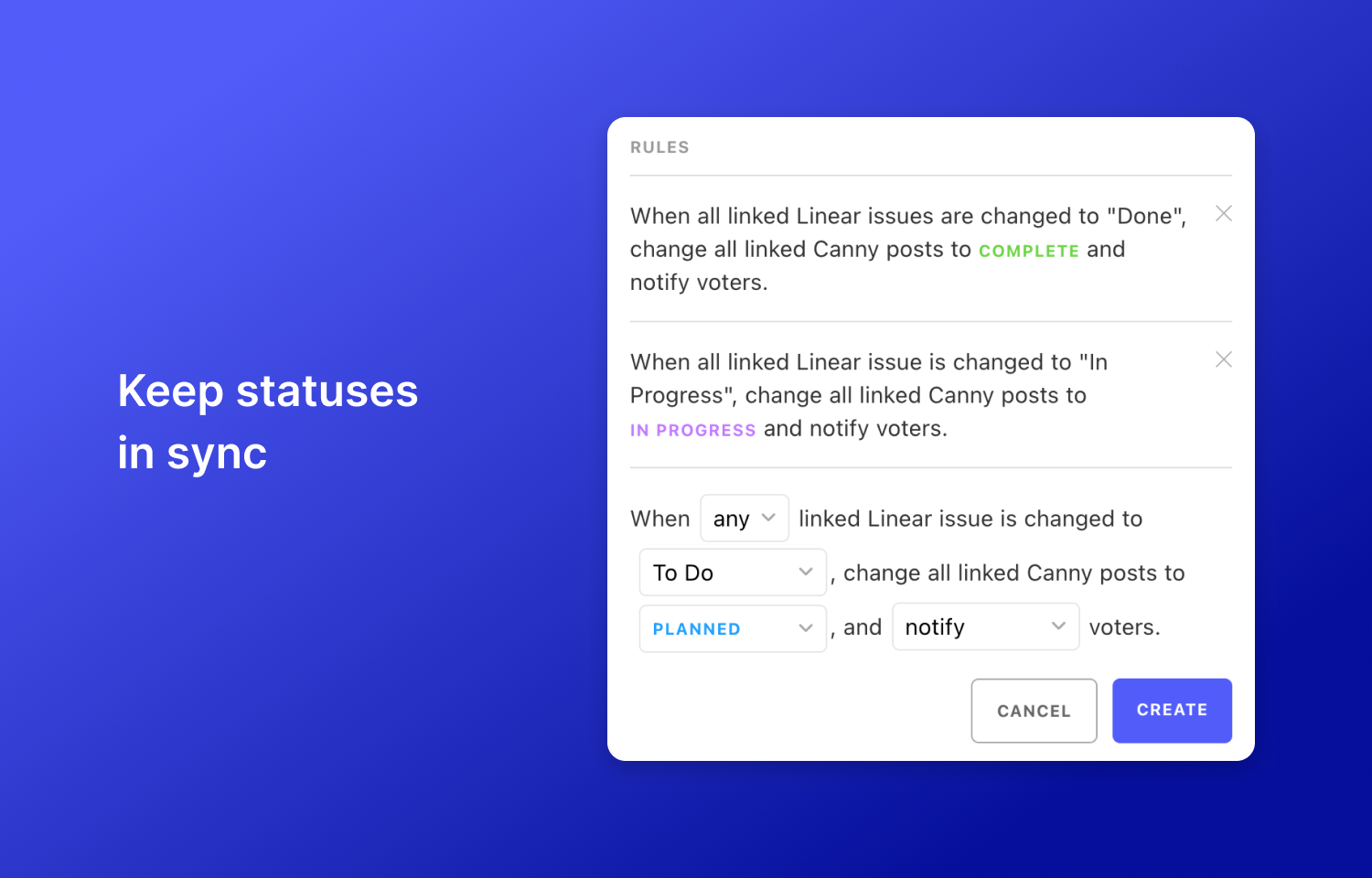 You can also set up rules so that when statuses are updated in Linear, they are reflected in Canny. This is a great way to keep your stakeholders in the loop. They will appreciate being kept up to date and your team will appreciate the simple workflow.