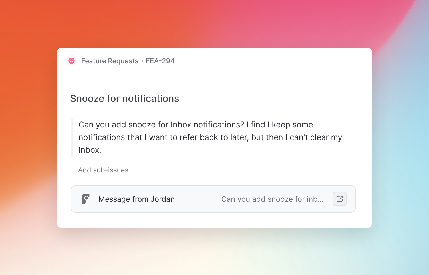 You can configure Front conversations to re-open when the linked issue is completed, canceled or a comment is made. This makes it easy to delight customers by getting back to them quickly on the status of their request or bug report. We'll automatically move linked conversations over if Linear issues are merged, too.