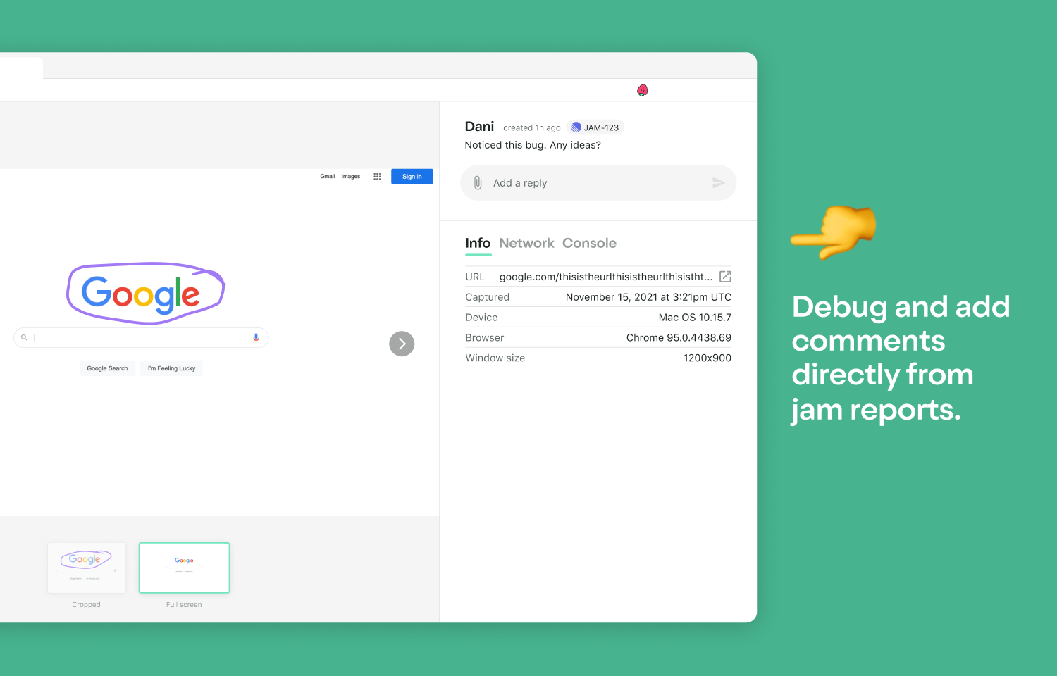 Send bug reports directly to Linear with all the details developers need. Jam auto-captures technical logs, and creates developer-ready bug reports in seconds.