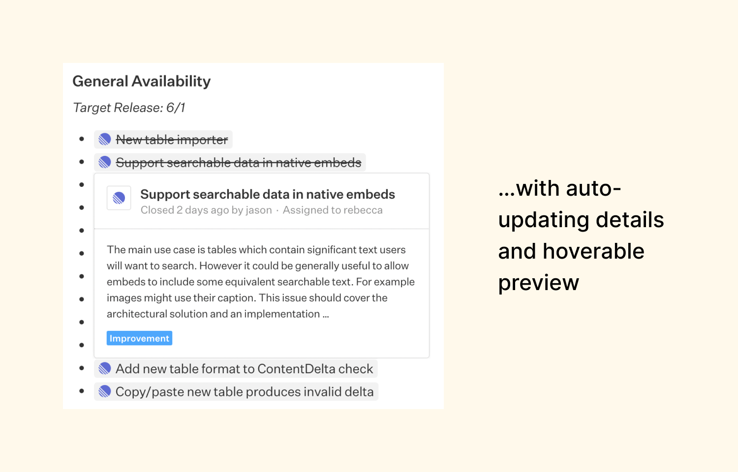 When you paste a Linear issue link into Slab, it will automatically turn into a rich mention link. Hovering over this mention link will preview the contents and details of the Linear issue.