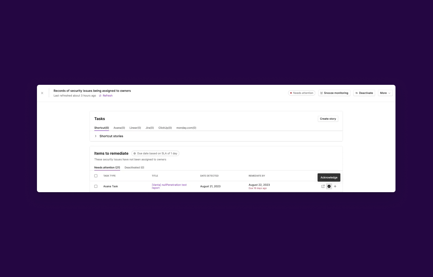 By integrating Linear, admins can create tickets from within Vanta to ensure issues are tracked through remediation.